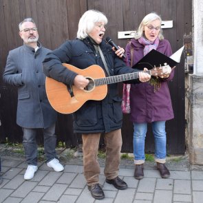 Der letzte Stein kam vor das neue Rathaus, denn August Biebinger wohnte in der Oggersheimer Straße 12 im Haus seines Bruders, das bis in die 1970er Jahre an dieser Stelle stand. Biebinger wurde im ersten Weltkrieg als Soldat schwer verletzt. Danach galt er als „geisteskrank“ und wurde von den Nazis in der „Heil- und Pflegeanstalt“ Frankenthal ermordet. An dieser Stelle spielte Uli Valnion begleitet von seiner Frau Ute, das Lied „Mein Vater wird gesucht“. Abschließend sagte Thorsten Leva: “Möge dieser Stolperstein uns im Vorübergehen erinnern, mahnen und dazu anregen, immer wieder neu hinzuschauen und für das einzustehen, was unsere Gesellschaft zusammenhält.“ Er bedankte sich dann noch einmal bei allen Mitwirkenden. Gunter Demnig und sein helfender Kollege Frank-Matthias Mann erhielten jeweils eine Flasche Mutterstadter Sekt. Der Künstler und Herr Mann sprachen der Gemeindeverwaltung, dem Bauhofverantwortlichen Marvin Metzger und seinen Kollegen Bastian Claus und Matthias Mugrauer, dem Stolperstein-Team und Ute und Uli Valnion, ein Lob aus für die Organisation und Durchführung der Verlegung in Mutterstadt, die beispielhaft sei.